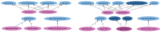 Original knowledge graph generated by DBpedia Spotlight (left) and the expanded knowledge graph (right). The additional RDF triples are highlighted.