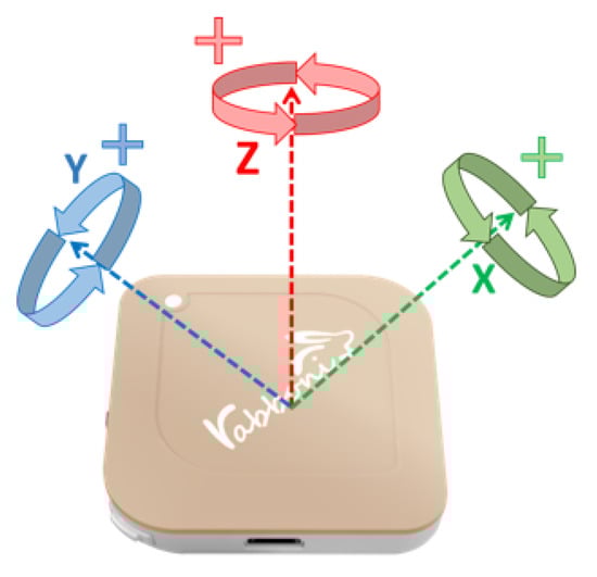 - Somatosensory game: In this study, the somatosensory game production involved the Scratch software combined with Rabboni sensors. As shown in Figure 1, the Rabboni sensor has a built-in six-axis gravity sensor (IMU, Inertial Measurement Unit), BLE Bluetooth transmission, and computing components that can transmit sensing readings in real-time. These sensors provide a variety of options regarding sampling frequency and dynamic range and are equipped with LED lights to indicate the operating status of Rabboni and its power display. The Rabboni sensor facilitates Android sensing signal acquisition with various programming educational applications, including Scratch, Python, Unity, Java, and App Inventor. Rabboni sensors were specially developed for AIoT (Artificial Intelligence of Things) programming education, app development, AI smart sensor interconnection, or motion detection-related research regarding various intelligent applications. In summary, the Rabboni AIoT Program Education Device possesses a gravity-sensing function and a complete programming language integration interface, such that a designed educational program can be synchronized with AI, IoT, and sensor learning.