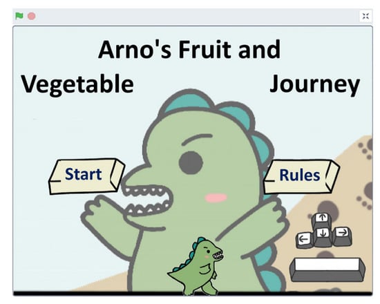 The educational goal of the somatosensory game design was to teach preschool children about healthy and junk food, through which children can learn correct nutrition knowledge and dietary habits through a fun and interesting experience. The name of the somatosensory game is “Arno’s Fruit and Vegetable Journey”, and the background of the game is that a dinosaur (Arno) wishes to have a healthy body. Thus, he decides to start looking for healthy vegetables and fruits to ingest them.