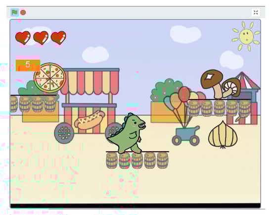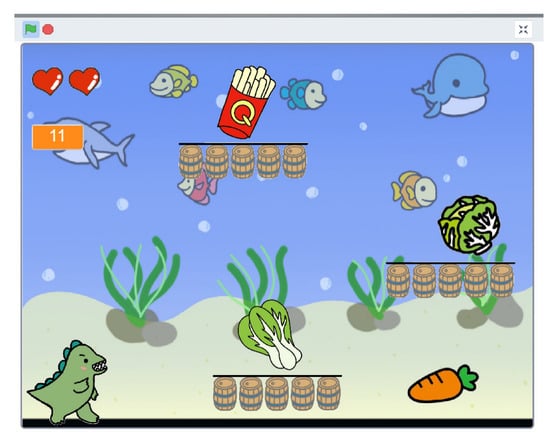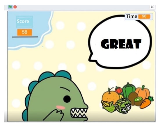 The figure below shows the design and configuration of the computer game Scratch interface. The start screen of the game shows the protagonist Arno the dinosaur; see Figure 2. The “Rules” button is clicked to display the scoring instructions. When the “Start” button is clicked, the game starts. In the background of the game, there are three levels (i.e., amusement park, sea world, and forest) in sequence, as shown in Figure 3, Figure 4 and Figure 5. Players can change the acceleration (acc X and acc Y) by using the Rabboni sensor device worn on their hands, in order to control the dinosaur Arno to move left and right to eat vegetables and fruits through tilting the sensor to the left or right. If the Rabboni sensor is tilted down, the dinosaur Arno will jump. When the three levels are completed, the game will display the “Great” successful screen, and the score will be displayed on the upper left of the screen; see Figure 6. If the player eats junk food three times, the three heart symbols (life points) on the game screen will disappear and they will fail the game. The “Game Over” screen appears to finish the game.