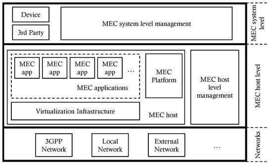 European Telecommunications Standards Institute (ETSI) initiated MEC standardization in 2014 []. The framework of MEC is illustrated in Figure 1 and it consists of three levels []: MEC system, MEC host, and network.