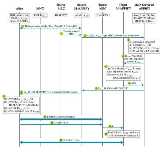 Kim et al. [] propose a handover authentication protocol for distributed application functions in a 5G MEC environment using AKMA. In the proposed handover protocol, user context transfer is done via the local MEC AFs. They also provide formal verification of their protocol.