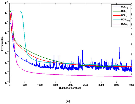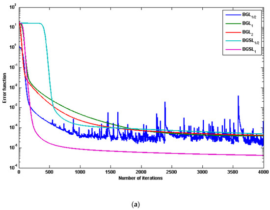 The average error and norm of the gradient and running time of 10 experiments are presented in Table 3. Through the results obtained from Figure 5a,b, respectively, we see that BGS has a better mapping capability than BGS, BG, BG and BG, with the error decreasing monotonically as learning proceeds and its gradient go to zero. Table 3 shows the preliminary results are extremely encouraging and that the speedup and generalization ability of BGS is better than BGS, BG, BG and BG.