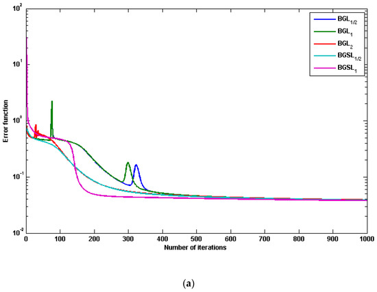 Table 1 shows the parameter settings for the corresponding network, where LR and RP are abbreviations for the learning rate and regularization parameter, respectively. Figure 3 and Figure 4 show the performance results of BG, BG, BG, BGS, and BGS for 3-bit and 6-bit parity problems, respectively. As illustrated by Theorem 1, the error function decreases monotonically in Figure 3a and Figure 4a, and the norm of the gradients of the error function approaches zero in Figure 3b and Figure 4b. According to the comparison results, our proposal demonstrated superior learning ability and faster convergence. This corresponds to our theoretical analysis. Table 2 displays the average error and running time of ten experiments, demonstrating that BGS not only converges faster but also has better generalization ability than others.