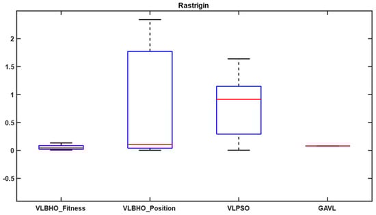 For Rastrigin, the fitness values are provided in Figure 3. We find that GAVL was the best because it accomplished the lowest fitness value compared with the other benchmarking algorithms.