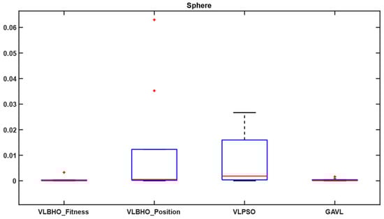 Figure 4. The fitness values after convergence for VLBHO fitness, VLBHO position, VLPSO for sphere.