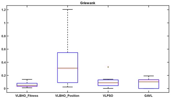 The fitness values for algorithms with respect to sphere are presented in Figure 4. As shown, VLBHO accomplished the best fitness value compared with the other algorithms followed by GVAL and then VLBHO. Similarly, visualizing the fitness value of Griewank in Figure 5, we find that VLBHO fitness provided the best performance compared with the benchmarks.