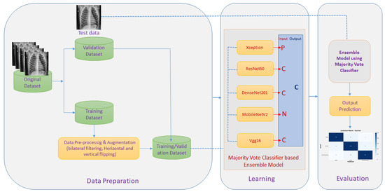 An ensemble method is a way to combine different learning approaches into a single predictive model. In order to develop a real-time automated system for COVID-19 detection from CRX images, deep ensemble CNN (DECNN) models have been trained and tested. As shown in Figure 3, five different models were employed in the proposed ensemble framework—Xception, ResNet50, DenseNet201, MobileNetV2, and VGG16—all of which were pre-trained on ImageNet and then fine-tuned using the chest X-ray image dataset.