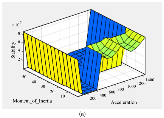 The Taguchi method is employed to systematically design and evaluate various combinations of motor parameters in order to establish the relationship between input parameters—such as moment of inertia, acceleration, and deflection—and the corresponding output parameter of stability. Subsequently, the degree of stability pertaining to the motor parameters is categorized into three clusters: low, medium, and high, as depicted in Table 6. The table provides further confirmation that stability is positively correlated with acceleration, while stability is negatively correlated with moment of inertia and deflection. A set of rules has been established to determine the status of stability within a fuzzy system, employing the Mamdani algorithm. The verification of stability in relation to the moment of inertia, deflection, and acceleration is also demonstrated through the utilization of fuzzy simulation, as depicted in Figure 5a–c.