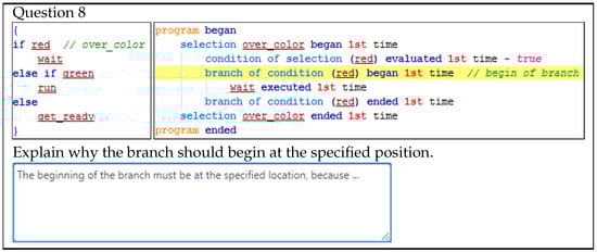 To understand how, in the student’s opinion, a program (or algorithm) works, the researchers can ask the student to build an execution trace of the given program. Sirkiä and Sorva asked students to simulate the execution of a small program by manually performing all actions of the program in the graphical interface of a visual simulator [5,14]. It concerned the data about values, operators, function calls, parameters passed to functions, call stack, changes in the execution position, etc. The researchers analyzed obtained traces of program code execution by each student. They reported, among other things, patterns of erroneous behavior, probably related to the complexity of the simulator’s user interface (UI). To reduce the cognitive load on the student, this approach can be enhanced by using simulators, focusing only on one aspect of the program behavior [33].