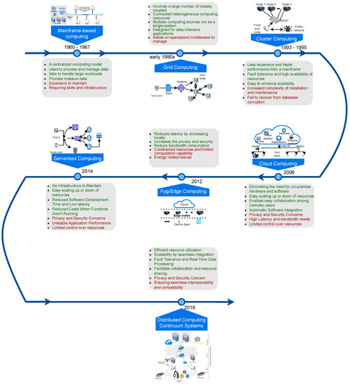 Several decades ago, computing began to rapidly solve complex calculations but was prone to errors; however, now it embodies the transformative power of technology [1]. In the beginning, computers occupied large rooms (huge in size) and had limited processing power, but now, they are portable and perform high-speed processing with extensive memory capacities. Developments in hardware, software (through the evolution of programming languages), and the Internet have helped modern computation encompassing large computations in a parallel and distributed manner [2,3]. In this regard, mainframe-based computing was the first Internet-based distributed computing architecture developed in the early 1960s. Furthermore, the computing paradigm extended to grid computing, cluster computing, cloud computing, and fog/edge computing [4,5,6,7]. The accessibility and ubiquity of computing have transformed almost every field, including education, healthcare, industries, entertainment, and space research [8].