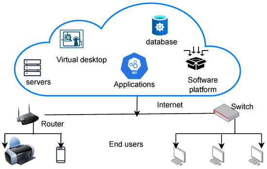 In recent decades, cloud computing has emerged as a significant technological advancement. It is widely recognized as a crucial computing environment for facilitating the growth, implementation, and operation of IoT platforms. In this context, businesses can transfer their control, computing capabilities, and accumulated data to a platform with nearly limitless resources [22]. Today, cloud computing continues to stand out as a widely accepted solution for deploying resource-intensive computational tasks, particularly for processing vast volumes of data generated from IoT devices spread across various geographical locations (i.e., including sensors, smartphones, laptops, and vehicles). The cloud computing paradigm offers extensive resources, enabling the deployment of diverse platforms, virtual machines, multiple databases, and various applications. With its scalability and flexibility, the cloud empowers users to harness a vast pool of computing power and storage, allowing them to create and manage these computing environments tailored to their specific needs (see Figure 5).