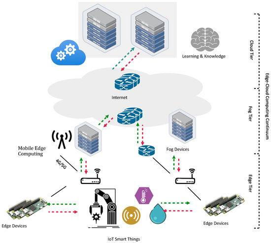 As can be observed, the edge and fog paradigms offer nearly indistinguishable attributes. Both concepts anticipate enhancing computational capabilities close to end-users and within the IoT domain. However, the primary contrast between these two paradigms lies in administrative distinctions and responsibilities [33]. Additionally, fog nodes (e.g., those stationed in base stations) might extend their services across more expansive geographical regions. For example, intelligent transportation systems could gain advantages by linking and analyzing vehicle data within the fog infrastructure. Nevertheless, both paradigms furnish low-latency services due to end-devices’ proximity to the data source, facilitating production and consumption. Furthermore, edge and fog devices typically have limited computational resources, storage capacity, and power compared to centralized cloud servers. This limitation can impact various application types that can be efficiently run at the edge, and resource-intensive tasks might still need to be offloaded to a more powerful cloud infrastructure.