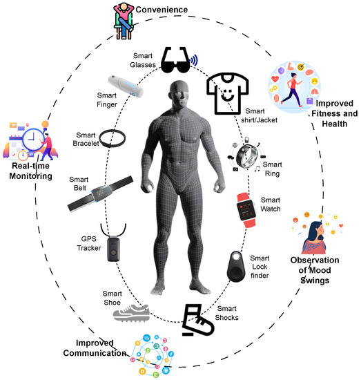 These days, wearable devices are commonly used as embedded devices that users wear and seamlessly integrate into their daily routines. These devices range from smartwatches and fitness trackers to augmented reality glasses. They are equipped with sensors, processors, and connectivity features that enable them to capture data and interact with users and other devices [50]. Wearables often monitor health metrics, track physical activity, deliver notifications, and provide quick access to information. They act as intermediaries between users and the broader network of devices due to their portability and constant presence. An illustrative example of wearable devices and their benefits is depicted in Figure 8. The benefits of these devices are wide, and include convenience, monitoring fitness and health, mood swing monitoring, communication with the environment, people or other devices remotely, real-time analytics and monitoring, and safety [51,52,53]. In 2020, the wearable technology market was valued at USD 59 billion, and by 2024, it should be valued at USD 156 billion, with an annual growth rate of 24.6% according to the GlobalData (Available online: https://www.medicaldevice-network.com/comment/wearable-technology-iot, last accessed 3 September 2023). However, most of these devices have very limited computing capacity, and their analytics depend on other computing devices in the continuum.