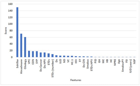 In Figure 4, the scores for each feature are shown after applying Chi2 to the dataset. We can see that Schiller is the most crucial feature, with 150.36 scores. Hinselmann and Citology have the second important features at 70.550 and 60.490, respectively. Dx, IUD. ND, VC, and HC.1 feature with scores between 4 and 3. HC, NPRE, Age, SmokesPY, FSI, IUD (years), and NSP are the lowest impacted features with scores below 1. ML models were applied to the 15 highest features.