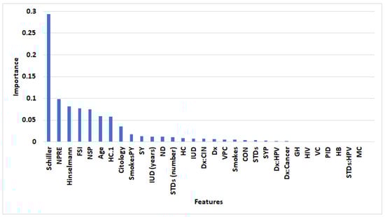 As shown in the Figure 5, features based on based trees are ranked in importance. We can see that Schiller is the most crucial feature, with 0.293634763 importance. NPRE and Hinselmann have the second important features at 0.098876738 and 0.081442887, respectively. HIV, VC, PID, HB, STDs:HPV, and MC are the lowest impacted features with importance below 0.00003. ML models were applied to the 15 highest features.