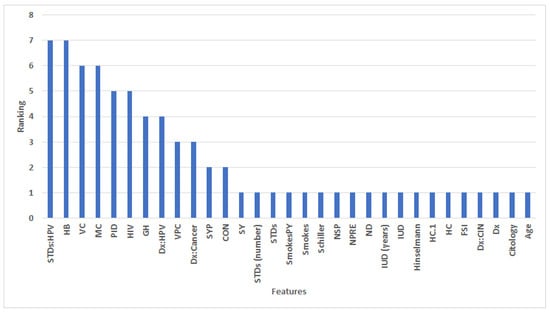 Figure 6 shows the ranking of features according to REF. There are 15 top features ranked 1 by REF, including SY, STDs (number), STDs, SmokesPY, Smokes, Schiller. The worst features are STDs:HPV and HB, which are ranked 7. ML models were applied to the 15 highest features.