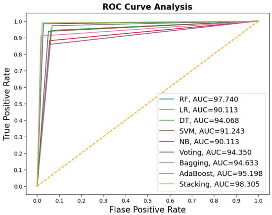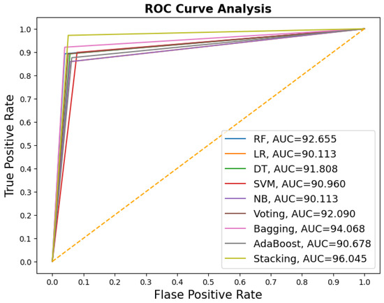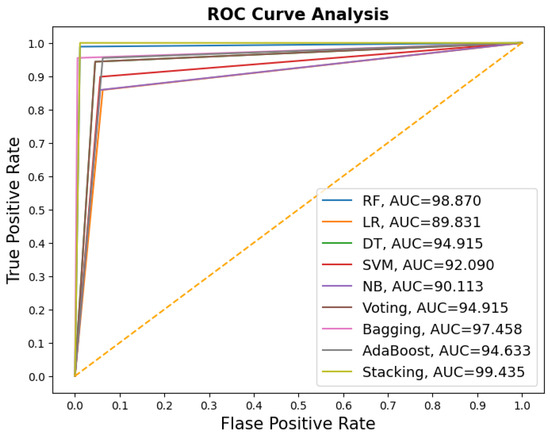 The findings depicted in Figure 9 provide a comprehensive overview of the ROC curve and AUC obtained from the ML models and ensemble models, utilizing tree-based feature selection methods. The stacking model emerges as the top performer, exhibiting an outstanding AUC of 98.305. Following closely, the RF model achieved second the highest AUC at 97.740. In contrast, the LR and NB models demonstrate the lowest AUC among the evaluated models, reaching 90.113. The stacking model is the most accurate, surpassing the models in classification accuracy.