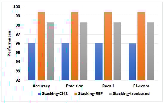 In this paper, we investigate the performance of ML models, the ensemble model, and the proposed stacking model with chi2, REF, and tree-based methods for feature selection. From Figure 10, it is clear that the stacking model using REF achieves the best results in comparison to chi2 and tree-based models. Stacking with chi2 was the least efficient model.