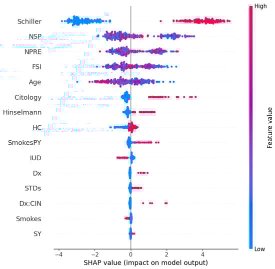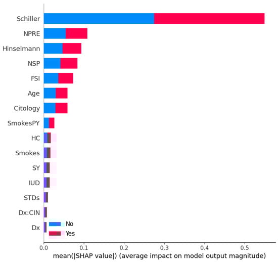 This section addresses global explainable (dataset level) and local explainable (instance level) output decisions. We use SHAP explainers to interpret the model provides local and global explanations. The experimental results prove that the stacking model with REF feature selection has the highest performance. We use SHAP explainers to interpret the model. The SHAP summary plot of the developed model is shown in the Figure 11. Several significant features of the entire dataset are important to the decision-making process, as shown in Figure 11. Each feature is represented by a horizontal line to show how it affects the output: blue means it causes the model to move in the lower direction, and red means it moves in the upper direction. YES or NO determination is significantly influenced by Schiller. Age, FSI, HC, and Hinselmann are considered the second essential features. STDs and DX are the lowest features that impact model decisions. Additionally, the Figure 12 shows the mean impact of each feature. Each bar represents the importance of a feature, and its length corresponds to the feature’s name on the X-axis. We can see that the Schiller feature most significantly impacts model decisions.