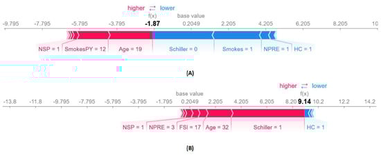 For example, instance with class 0 is shown in Figure 13A, which presents the force plot of cause for class 0 to present the features that are contributed for this model prediction. Based on the model’s average over the entire dataset, the predicted value’s base value is 2.205, and predict_proba is −1.87. The arrows represent the value of the features (NSP = 1, SmokesPY = 12, Age = 10, Schiller = 0, Smokes = 1, NPRE = 1, HC = 1). Features with a big arrow have a significant impact, while features with a short arrow have a smaller impact. Features with red arrows contribute to higher scores, and blue arrows contribute to lower scores. For example, a cause with class 1 is shown in Figure 13B due to the features contributing to the model prediction. Based on the model’s average over the entire dataset, the predicted value’s base value is 0.2049, and predict_proba is 9.14. The arrows represent the value of the features (NSP = 1, NPRE = 3, FSI = 17, Age = 32, Schiller = 1, HC = 1).