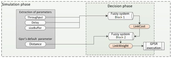 FzGR gathers two proposed approaches (Figure 1). The first approach computes the score of each one-hop from three QoS measures to support the choice of the optimal next-hop, hence meeting the needs of users. The three quality measures calculated for this purpose are delay, throughput, and the size of the buffer. The second approach uses the relevant score beside the principal metric on which the GPSR is based, i.e., distance between each neighbor and the final destination, in order to comply with the standards of this protocol. The output of each approach is calculated by the fuzzy logic controller (FLC).