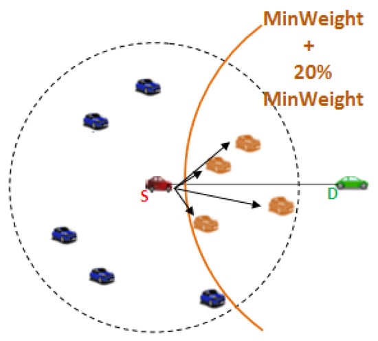To avoid congestion and to improve the delay of transmission, we asked ourselves whether it was possible to strike a balance between a large number of packets and a set of effective neighbors. In fact, the intelligent routing protocol MNH-FGR elects dynamically the interesting next-hops (next neighbors) according to the state of the network, as depicted in Figure 2. Thus, the sender can select a single hop, two hops, three hops, etc., without exceeding the maximum threshold assigned to the weight of the link. This threshold is expressed by Equation (1):
