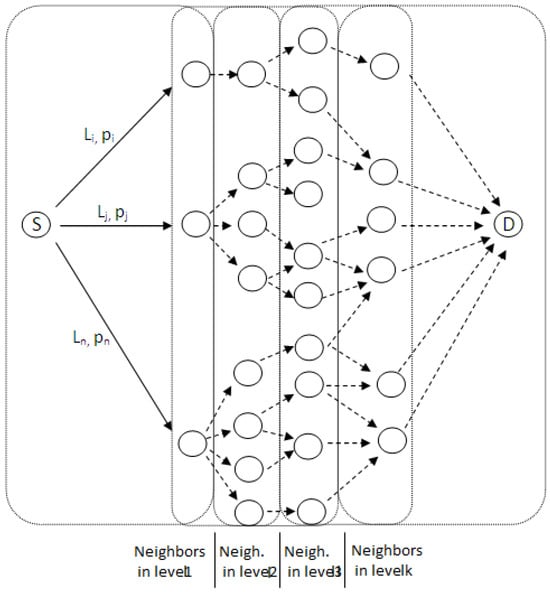 n weighted links between each sending node and its direct neighbors from the source S to the destination D.