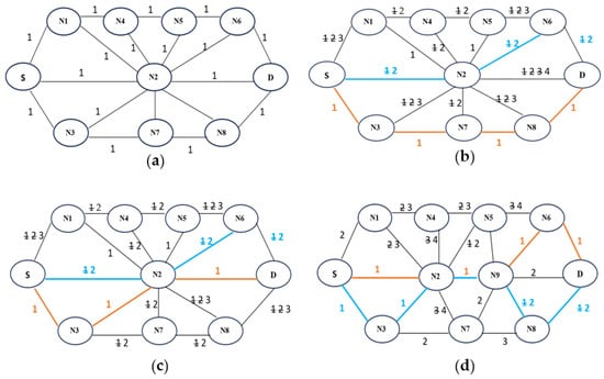 In order to maintain a high degree of connectivity and ensure a good quality of service (QoS), several algorithms have been developed by researchers in the field of wireless networks. These algorithms are based on the idea of exploiting all nodes of the topology to ensure the continuity of the data flow. Whether for a vehicular ad hoc network (VANET), mobile ad hoc network (MANET), or even for a wireless sensor network (WSN), the multi-path approach has shown great promise [,]. Indeed, various existing routing protocols have improved their performance by taking into account effective multi-path strategies.