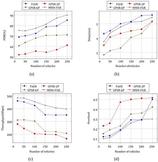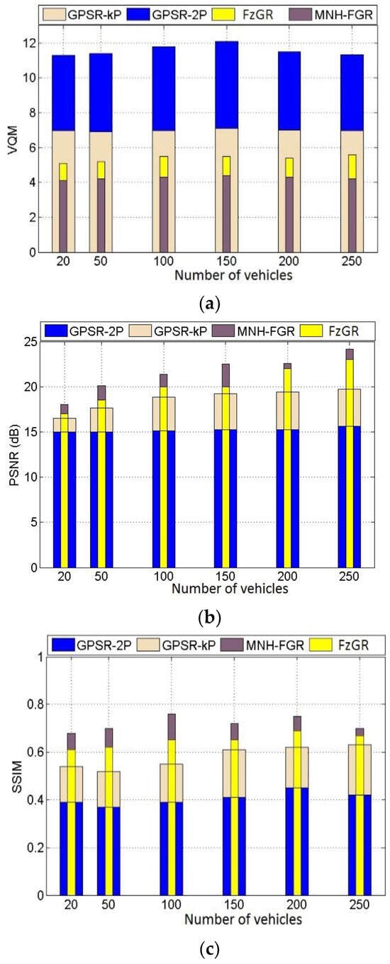 In the context of multimedia data transmission over vehicular networks, the instability and the dynamism of communicating vehicles (nodes) impacts significantly the quality of the video during the transmission [,]. The FzGR protocol improves the streaming quality, either in terms of quality of service (QoS) or quality of experiment (QoE). However, the transmission delay must be further enhanced while keeping good performance.