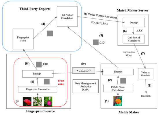 - Fingerprint Source: This entity is considered to be a trustable entity. It is responsible to create a key K and (at least) three disorder keys, Ka, Kb, and Kc, so that the Match Maker can encrypt the unknown photo in the same way. While the Match Maker extracts the PRNU noise from the unknown photo, the Fingerprint makes the fingerprint out of the known set of photos. In addition, it encrypts the fingerprint into three encrypted photos.