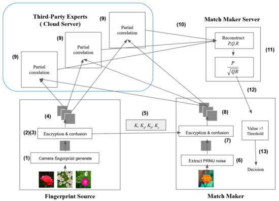 - Fingerprint Source uses the key K to encrypt the camera fingerprint into three encrypted photos A, B, and C.