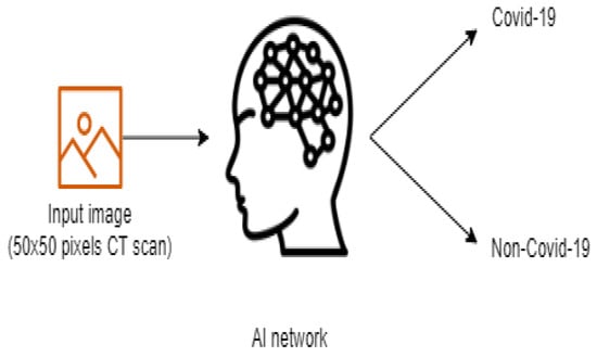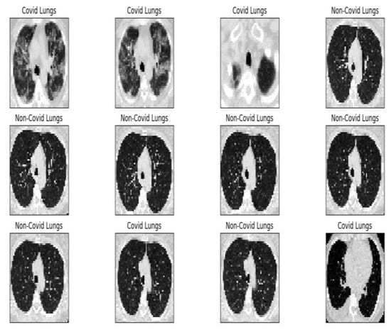 Project development started by establishing the data set according to the objective. For this, we used a public data set provided by the www.kaggle.com platform. The set comprises 2481 images (1251 contain lungs with COVID-19 infection and 1230 contain lungs without COVID-19 infection). At the beginning of the program, each image receives the appropriate label, “covid” or “normal”, which is resized to 50 × 50 pixels (see Figure 2) and undergoes conversion to grayscale (grayscale format). After these transformations, the image–label pair is passed as an entry in an array. Further, a block list containing the values of the main parameters used in the inference process is presented in Figure 3.