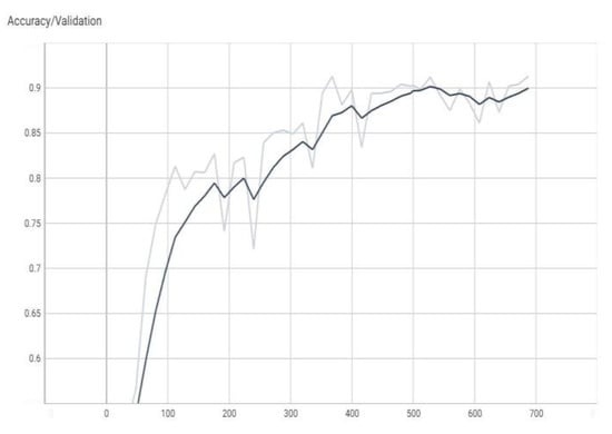 The value of accuracy during validation (the dark color curve is the definitive value curve, while the pale color curve is the curve training using AI).