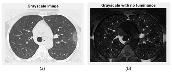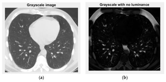 Grayscale versions of the non-COVID-19 lung image: (a) grayscale image and (b) grayscale with no luminance.