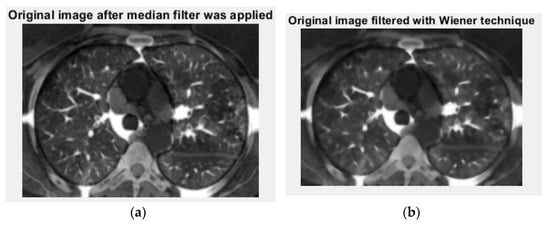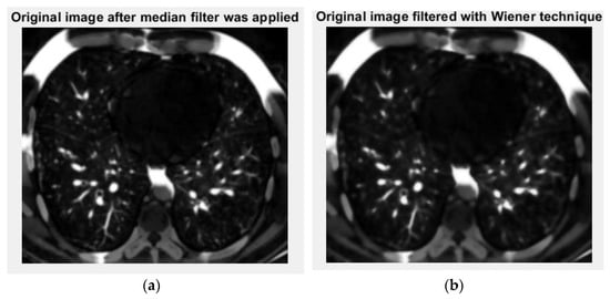 Filtered versions of the non-COVID-19 lung image: (a) original image after a median filter was applied and (b) picture filtered in the Wiener technique.