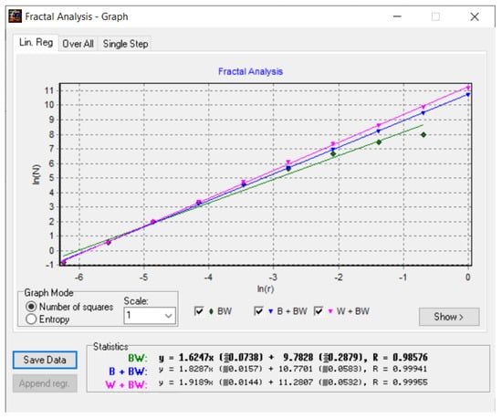 In the coordinate system ln(N(r)) as a function of ln(r), used in Figure 24, the multiple linear regression technique was applied to obtain the values of the fractal dimension of the CT picture of the non-COVID-19 lung, more precisely, to verify the obtained values with the box-counting algorithm, as in Figure 23.