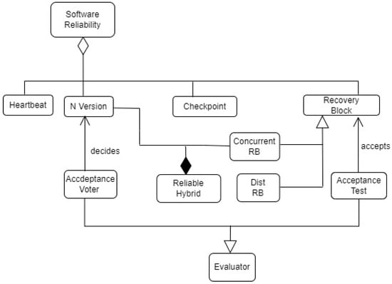 Patterns can be effective for designing secure systems. Accordingly, security patterns have been studied extensively, and many publications about them exist, including surveys and catalogs [,]. However, there is relatively little work on the use of patterns for building dependable systems and no catalogs or general surveys, although they can have a similar design value. By dependability, we understand the ability to deliver service that can justifiably be trusted []. In this definition of dependability, we include reliability, safety, availability, fault tolerance, and maintainability. Sometimes security is also included as part of dependability [,], but we leave it out because, as indicated, it has been studied extensively on its own, e.g., [,,,,,]; Avizienis et al. in [] do the same. Reliability is a property that allows some function, task, or service to behave as intended when required and measures the continuity of correct service. Reliability is particularly important in critical infrastructures and is a fundamental prerequisite of safety. Fault tolerance masks execution faults and is an important mechanism for obtaining reliability. Availability implies that a function, task, or service should be ready for service when needed. Safety is a property that allows some function or service to operate in a manner that does not cause harm to humans or damage to valuable systems. Maintainability measures the ability of a system to be modified or repaired (see more detailed definitions in Section 2.1).