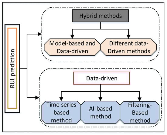 The field of RUL prediction for batteries has experienced a significant transformation, moving away from conventional empirical techniques to embrace more advanced data-driven approaches. Early methodologies primarily relied on simple time-based degradation models, which had limited adaptability when confronted with battery degradation’s dynamic and nonlinear nature under varying operational conditions. However, recent advancements have introduced numerous techniques that harness the wealth of data collected during battery operation, significantly enhancing the accuracy of RUL predictions. The landscape of battery RUL prediction can be categorized into three key approaches: physics-based models, data-driven models, and hybrid models. Each approach possesses unique strengths and limitations, and their utilization depends on specific requirements. Physics-based models delve into the intricacies of battery processes, offering insights into the causes of degradation but requiring precise calibration. Data-driven models leverage extensive datasets, with both shallow and deep learning techniques contributing to enhanced prediction accuracy. Hybrid models merge the strengths of data-driven and mechanistic models, improving stability and precision. Predicting the RUL of LIBs is a complex task influenced by various factors, presenting opportunities for innovative research to enhance accuracy and address existing challenges []. RUL prediction plays a pivotal role in battery health management and assessing the value of retired batteries. In cascading utilization, estimating the RUL ensures timely replacement, preventing safety issues. Calculating a battery’s reserve life (RUL) is difficult because of the variety and complexity of the elements that affect it, including the battery’s health, past performance, and failure modes. RUL prediction methods can be broadly categorized into two main groups: data-driven and hybrid approaches, as shown in Figure 1.