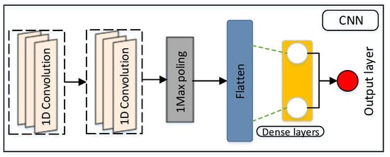 CNNs are a potent class of neural networks that are highly renowned for their proficiency in various deep-learning applications. They are a specific type of feedforward neural network (FNN). The architecture of CNNs comprises convolutional and pooling layers, which are particularly adept at extracting pertinent features from data. Subsequently, one or more fully connected layers come into play, and these features are leveraged to make predictions. During the training process, the CNN acquires the ability to correlate the extracted features with the appropriate labels. This achievement is unlocked through iterative mechanisms such as backpropagation and optimization [,]. A typical CNN comprises several essential layers, including the input, convolutional, pooling, fully connected, and output layers. These networks are widely used in various deep-learning tasks. CNNs are designed to operate on multi-dimensional input feature vectors. The convolutional layers play a crucial role in identifying intrinsic relationships within the data by extracting feature maps. These feature maps are then processed through pooling layers, which perform subsampling to reduce network complexity and prevent overfitting. The convolutional kernel operates on the width of the convolution development, further improving the extraction of relevant feature information. Finally, the fully connected layers integrate the processed data following the convolution and pooling stages. These merged data are subsequently fed into the final layers of the network, often including a fully connected or recurrent layer for making predictions, as shown in Figure 3, which is a basic CNN architecture.