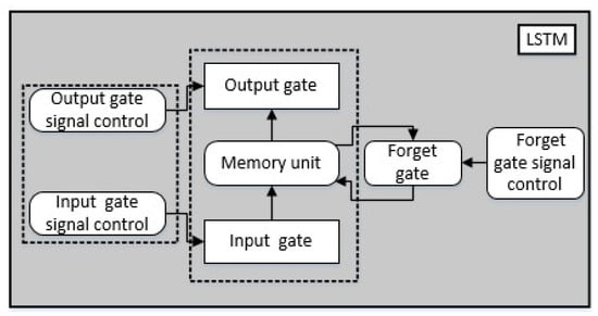 Due to the nature of the data collected from LIBs, which involve charging and discharging cycles and are essentially time-series data, using an RNN is a reasonable choice for processing such sequences while leveraging internal memory. RNNs are equipped with internal feedback and feedforward connections among their processing units, allowing them to handle sequential information. However, it is important to note that RNNs have limitations, particularly when dealing with long sequences. They can only store a portion of a sequence, which can lead to reduced accuracy when dealing with longer sequences []. In this context, where LIB data sequences are relatively lengthy and consist of numerous time series, LSTM networks are preferred over traditional RNNs. LSTM is a specialized type of RNN designed to overcome the challenge of handling long-distance dependencies in sequences. LSTM networks are particularly effective at capturing and learning from sequences with extended context, making them well-suited for tasks involving time dependencies. For instance, LSTM models can effectively model how a battery’s capacity changes over time during discharging profiles. One key feature of LSTM is its ability to maintain a certain level of correlation between hidden-layer nodes. When the network receives sequential data, the hidden-layer nodes’ computations rely on both the current input and the activation levels of the nodes from earlier time steps. When processing sequences that are input-related for LIBs, the LSTM network layer processes both the output and hidden-layer sequences. This allows it to efficiently identify intricate patterns and dependencies in the data. The input gate, forgetting gate, and output gate are the three gates that allow the LSTM to function. Together, these gates enable the data to write, read, and maintain long-term dependencies. Figure 4 depicts the layout of the LSTM abstraction network.