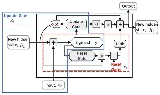 where (the reset gate) defines how much of the last hidden state to reset or forget when computing the new hidden state at time step t based on the current input . The sigmoid activation function squashes the weighted sum of the input and previous hidden state, ensuring that takes values between 0 and 1, thus controlling the amount of reset involved in Equation (3).