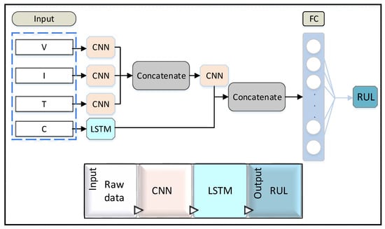 Our battery RUL prediction methodology uses a hybrid deep model that combines a CNN and an LSTM network in a data-driven manner. In order to extract characteristics from several quantifiable data sources, such as voltage, current, temperature, and capacity, these two components operate in parallel, as shown in Figure 6. The CNN focuses on extracting features from multi-channel charging profiles, while the LSTM specializes in capturing features from historical capacity data associated with discharging profiles while considering their time-dependent nature.
