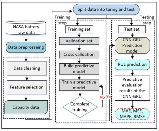 Simultaneously, a GRU layer models the temporal dependencies in capacity data, which are inherently related to time-dependent behavior. The fourth phase divides the preprocessed data into training, validation, and testing sets. This division ensures that the model is effectively trained on historical data, validated for robustness, and rigorously tested for predictive accuracy. The selected model architecture is fine-tuned and trained using preprocessed data during training. This process enables the models to capture intricate patterns in battery behavior, further enhancing the predictive capabilities. Our trained models estimate and evaluate the battery’s RUL in the final phase. We evaluate the precision and dependability of our predictions using specialized error measures designed for RUL prediction tasks. The process begins with step 1, battery data, where essential information related to the batteries is gathered. In step 2, data preprocessing, this collected data undergoes cleaning and organization. In step 3, train model for RUL estimation, the preprocessed data is utilized to train a model capable of estimating the batteries’ remaining useful life (RUL). The final step, step 4, method evaluation, involves evaluating the model’s performance to determine its effectiveness in predicting battery life. These four steps provide a structured workflow for managing battery data and estimating RUL, as shown in Figure 2, which illustrates the overall framework of the proposed approach.