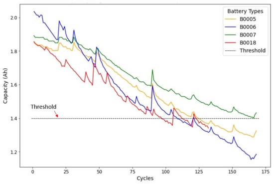 Our study commences with an introductory examination of the dataset in [], which encompasses four LIBs, namely, B0005, B0006, B0007, and B0018. These batteries have undergone a series of charge, discharge, and impedance operations. The impedance analysis was conducted using electrochemical impedance spectroscopy (EIS) across varying frequencies. Consecutive charge and discharge cycles have led to the expedited aging of the batteries, and this aging process was reflected in the evolving internal battery parameters, as unveiled by the impedance measurements. The selection criteria were their initial state of health (SoH), capacity, and model name. There were two thorough steps in the billing procedure. The end-of-life (EoL) criterion was reached, which signified a 30% capacity decline from the initial rated capacity of 2 ampere-hours (Ahr) to 1.4 Ahr. At that point, the studies were terminated. These datasets hold valuable potential for forecasting the residual charge (within a designated discharge cycle) and the batteries’ RUL. This study’s dataset included aging data for 18,650 lithium cobalt oxide batteries with a 2 Ah capacity, which were generously provided by NASA. The analysis focused on the cycling behavior of four specific lithium batteries, and all analyses were conducted at room temperature. The results of this analysis unveiled the capacity decay curves for B0005, B0006, B0007, and B0018 at a temperature of 24 °C, as illustrated in Figure 8.