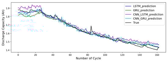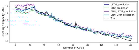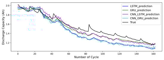 In Figure 10, we visually compare the predictive performance of the four deep learning models for discharge capacity (Ah) prediction over multiple cycles in scenario 3. The x-axis tracks the cycle counts, while the y-axis shows the discharge capacity values. The lines represent model predictions: blue for LSTM, green for GRU, magenta for CNN-LSTM, and cyan for CNN-GRU; in addition, the black line for True represents the actual observations. This visualization helps assess how these models predicted discharge capacity throughout the cycles.