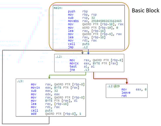 In this study, as a method for detecting similarities between different software products and programs, we use a distributed representation of assembly code obtained by statically analyzing the executable code of software products and programs. Distributed representation is a method for embedding discrete objects, such as inguistic symbols, into a vector space and representing them as real-valued vectors; typical methods include Word2Vec [14] for words, Doc2Vec [15] for sentences, and Code2Vec for snippets of program code [16]. In the proposed method, the assembly code and the control flow graph (CFG) (Figure 1), which represents the control structure of the program based on the assembly code, are represented as vectors using a distributed representation of graph data known as graph embedding [17,18,19,20,21], which is a distributed representation of graph data. This enables a fixed-length vector representation that reflects the meaning and control structure of the target. If the semantics and control structures of different programs are similar, the generated vectors will be close in vector space. This allows the comparison of expression vectors to identify similar software products and programs. In addition, by using assembly code obtained from executable code, the approach is not dependent on the existence of source code or a common development anguage by the target software products. In our experiments, we evaluate the proposed method by classifying the obtained expression vectors among programs derived from a single program that have partial modifications to the source code of that program but no significant differences in the overall control flow.