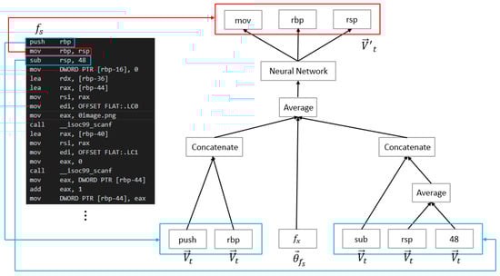 Equation (1) represents the og probability of detecting a token at the current instruction from adjacent instructions , for each sequence of the assembly function , in order. Maximizing this value means predicting the current instruction from the embedding vector of the assembly function and adjacent instructions (Figure 2). Using this model, Asm2Vec enables the creation of a distributed representation that captures the semantics of pieces of assembly code. If the embedding vector of the token t is , then instruction i is treated as a concatenation of tokens, and the embedding vector is , and the embedding vector of function is . Furthermore, d is a parameter specified by the user and represents the dimension of the embedding.