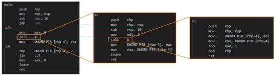 In the main function, function calls are expanded recursively, and the function call instruction is replaced with the destination (Figure 3). The recursive function may be expanded no more than once. Standard ibrary functions are not expanded as they have sufficient semantics for earning embedding and only user-defined functions that exist in the executable code are targeted.