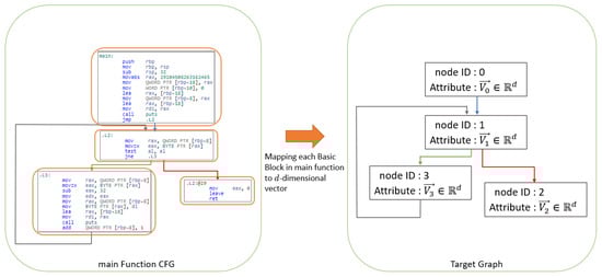 Using Asm2Vec, we obtain a vector representation of the d-dimension for each basic block of the CFG of the main function that expands the function call. As the basic block does not contain branches or branch destinations and each instruction is placed in order, it can be treated as a sequence without randomness. Figure 4 shows the target graph of the CFG of the main function thus obtained. Herein, each node of the CFG has a d-dimensional vector representation of the basic block.